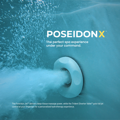 The Poseidon X™ jet configuration channels deep-tissue power with a broad, pulsating flow — perfect for soothing sore muscles after a long day. Pair it with Poseidon Jet™ & Trident Diverter Valve™, you gain total control over your massage experience — adjust the intensity, switch jet zones, and direct flow exactly where your body needs it most. Together, they create a spa experience tailored to you — every time.